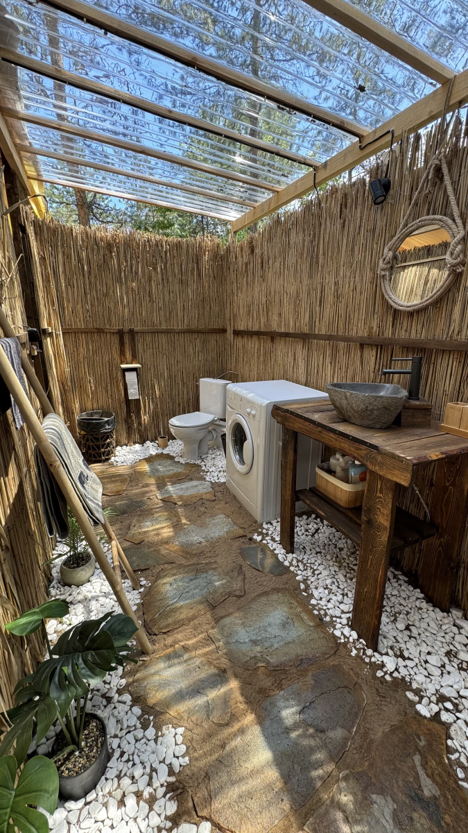 The caravan features a bathroom equipped with its own toilet and hot water.